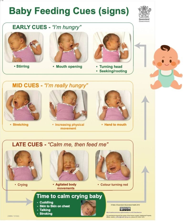 Watch for signs of hunger rooting, sucking on hands, fussiness, or lip smacking.